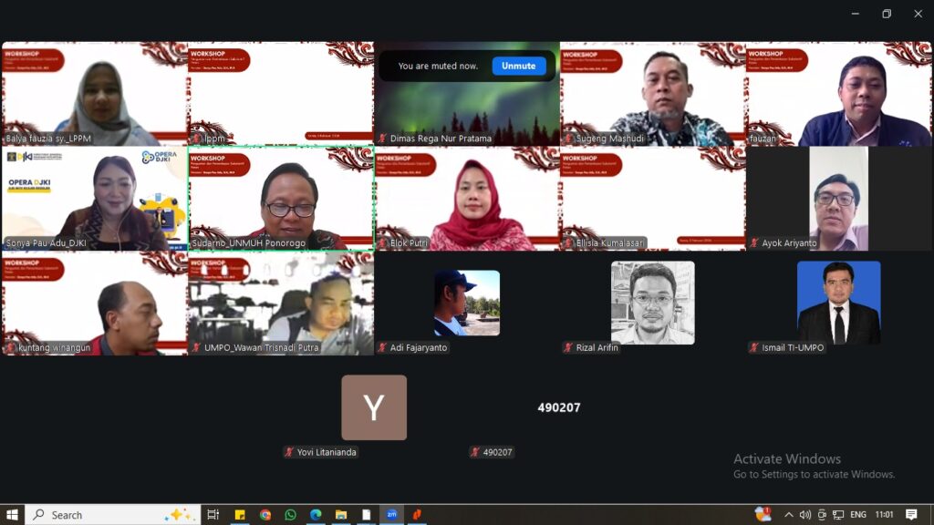 Lembaga Penelitian dan Pengabdian kepada Masyarakat (LPPM) Universitas Muhammadiyah Ponorogo Telah menyelenggarakan Workshop Penguatan dan Pemeriksaan Substantif Paten pada Kamis, 5 Februari 2026, pukul 09.00 WIB, yang dilaksanakan secara daring melalui Zoom Meeting.